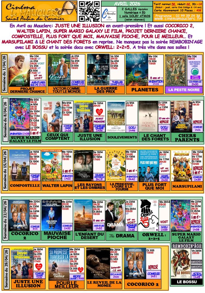 Retrouvez du 1er Avril 2026 au 3 Mai 2026 notre sélection de films:
